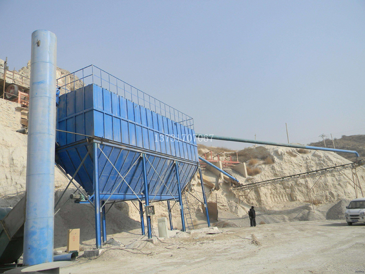 礦山企業配套的石料生產線除塵器每箱室濾袋條數分為32、64、96、128四個系列。一臺除塵器由數個箱室組成,各箱室側面出口管道上設有氣缸帶動的提升閥。當除塵器的阻力或時間達到預先設定值(阻力一般為1500Pa)時,PLC控制器則發出信號。第一個箱室的提升閥就開始關閉,以切斷過濾氣流。然后這個箱的脈沖電磁閥(每箱一個)開啟,壓力為5~7kg/cm²的壓縮空氣涌入袋室以清除濾袋上的粉塵。當下這個動作完成后(大約10~15秒時間),出口管上的提升閥重新打開,使這個箱室重新進入過濾狀態,各箱室依次按上述過程進行清灰。氣箱式脈沖袋除塵器采用分箱清灰,清灰時,逐箱隔離,輪換進行,避免了噴吹式脈沖袋式除塵器的粉塵二次飛揚問題,同時又保證了清灰的效果。整個箱體設計采用了進口和出口總管整體結構,灰斗可延伸到進口總管下,使含塵煙氣直接進入已擴大的灰斗內而達到預收塵的效果,并取消了易出現堵塞的水平直管。所以,氣箱脈沖袋式除塵器不僅能處理一般濃度的含塵氣體,也能處理高達1300g/Nm³濃度的含塵氣體。