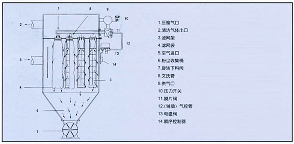 含塵氣體由進氣口進入灰斗(沒有灰斗的將直接進入袋室),然后經由灰斗進入裝有濾袋的過濾室。粉塵附在濾袋的外表面,凈化后的氣體油濾袋進入上部箱體,再經排風管道,由風機排到大氣