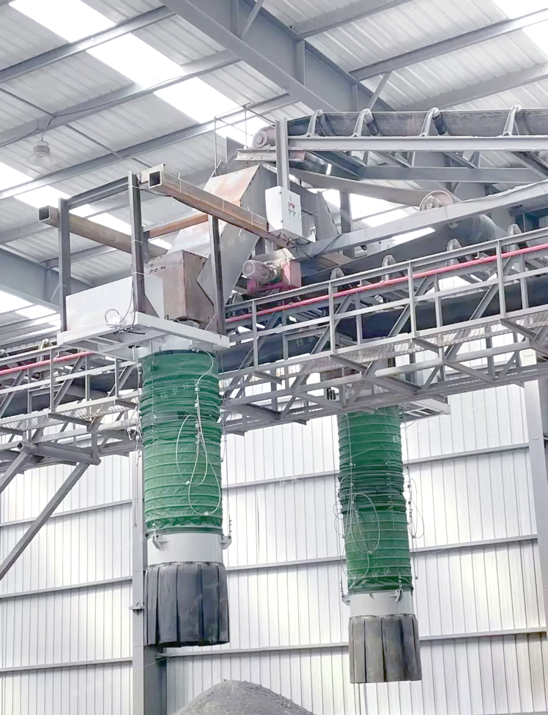 具有除塵功能的卸料溜筒采用吊帶式結構,使各節溜筒間有一定的上下左右4個方向的自由度,減少傳統鋼性套管間依靠法蘭導向連接容易卡滯變形且故障率高的缺陷,也可降低由于溜筒及其帆布圍裙貼近物料,在風大的時候可能引起溜筒變形的故障率。