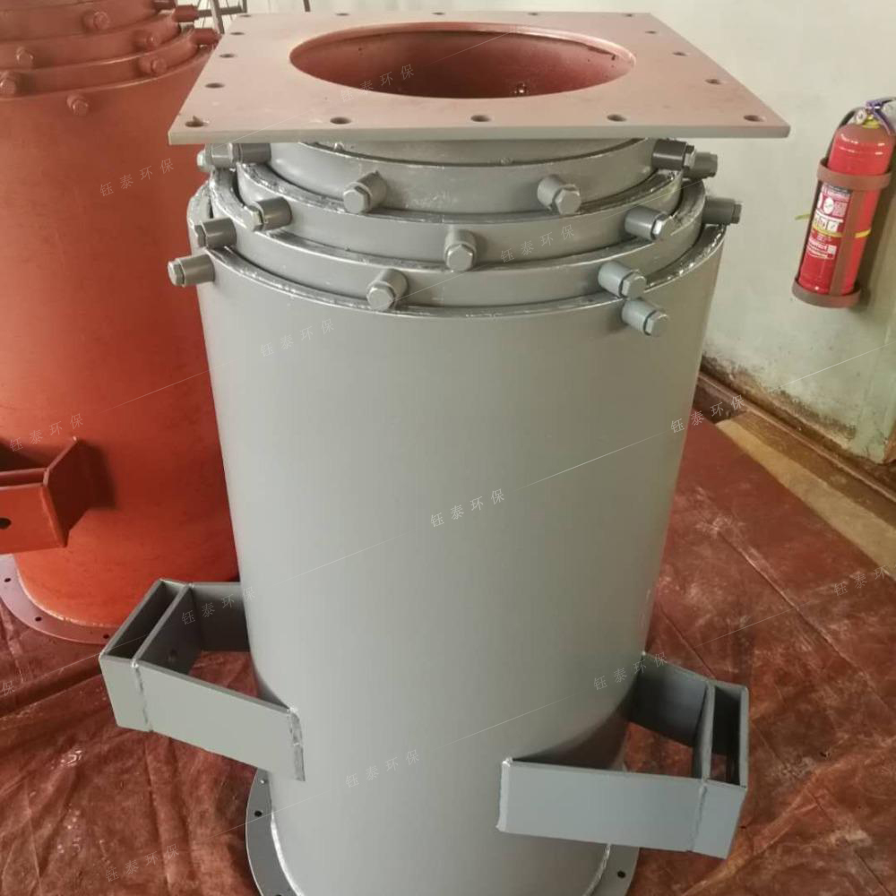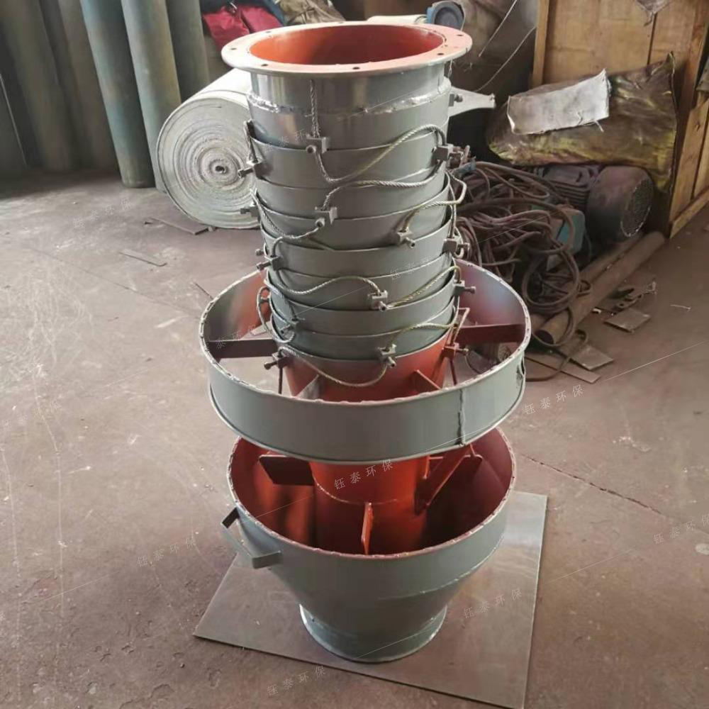 制作外伸縮布袋方式:要求伸縮布袋上每2個相鄰漲圈之間的垂直間距必須≤10cm,見圖1。當外伸縮布袋折疊后2個相鄰漲圈之間的布袋向內褶皺時,不能阻擋住與內直鋼套筒外壁之間形成的環形負壓吸塵通道的橫截面,從而降低負壓吸塵的通過量。客戶使用現場反饋漲圈間距大的吸塵氣流明顯比漲圈間距小的吸塵氣流更加順暢。
